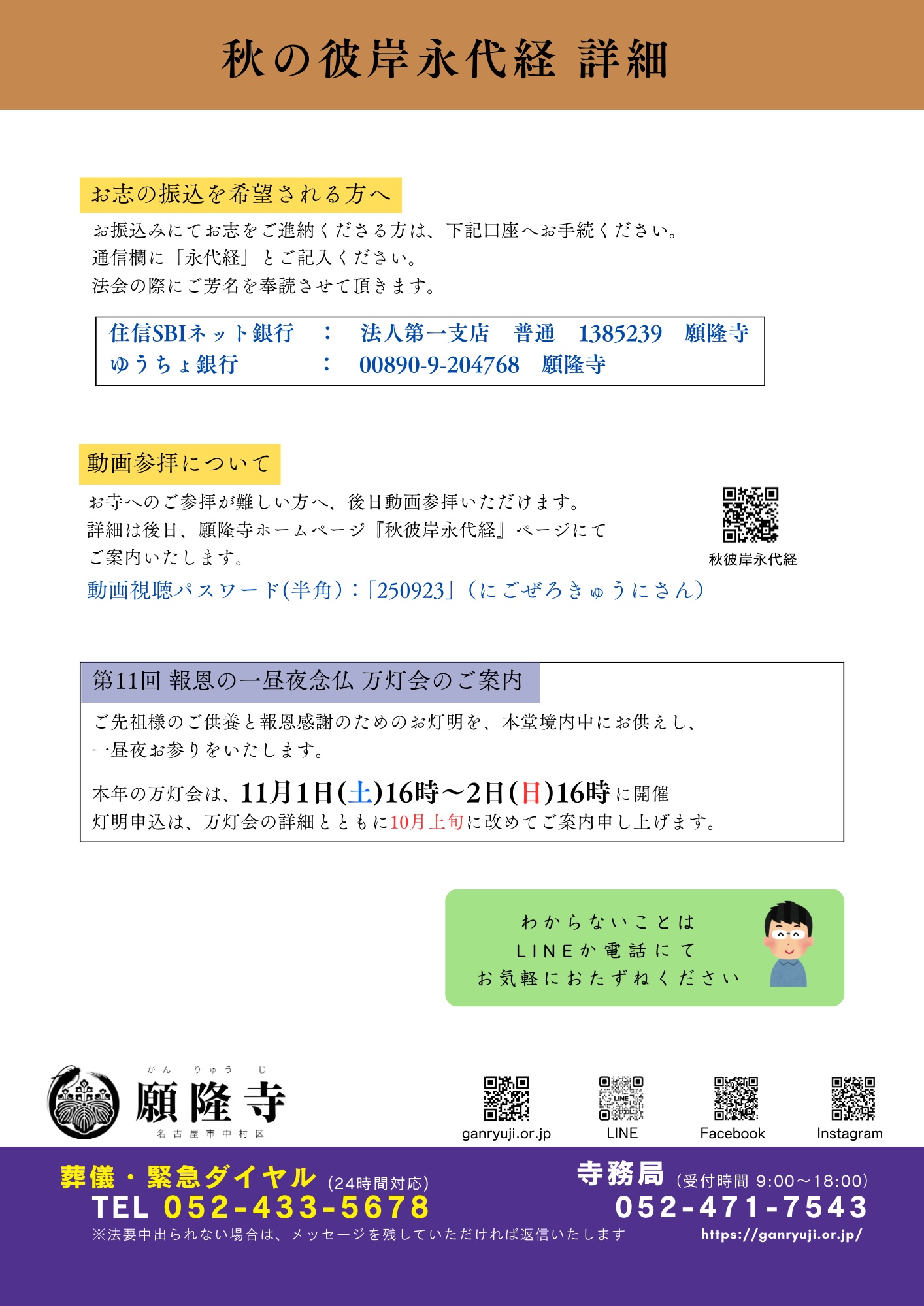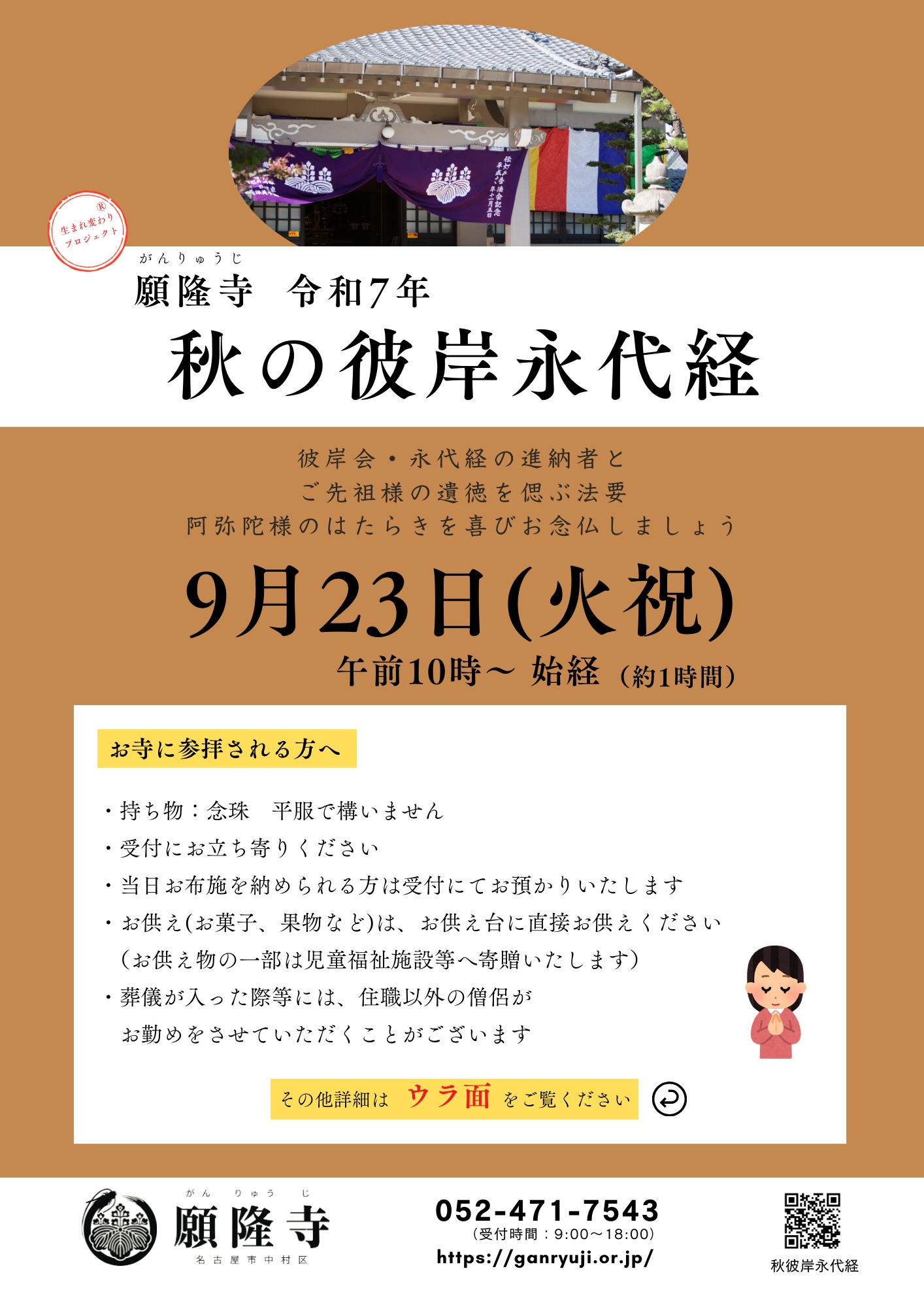 今年も下記の通り秋彼岸永代経を厳修いたしますので、ご参詣下さいますようご案内申し上げます。なお、檀信徒の皆様へのご案内は書面にてお送りいたします。
