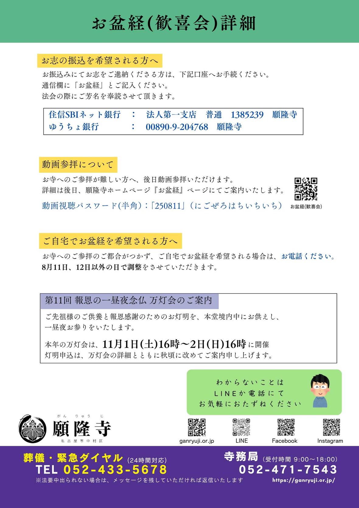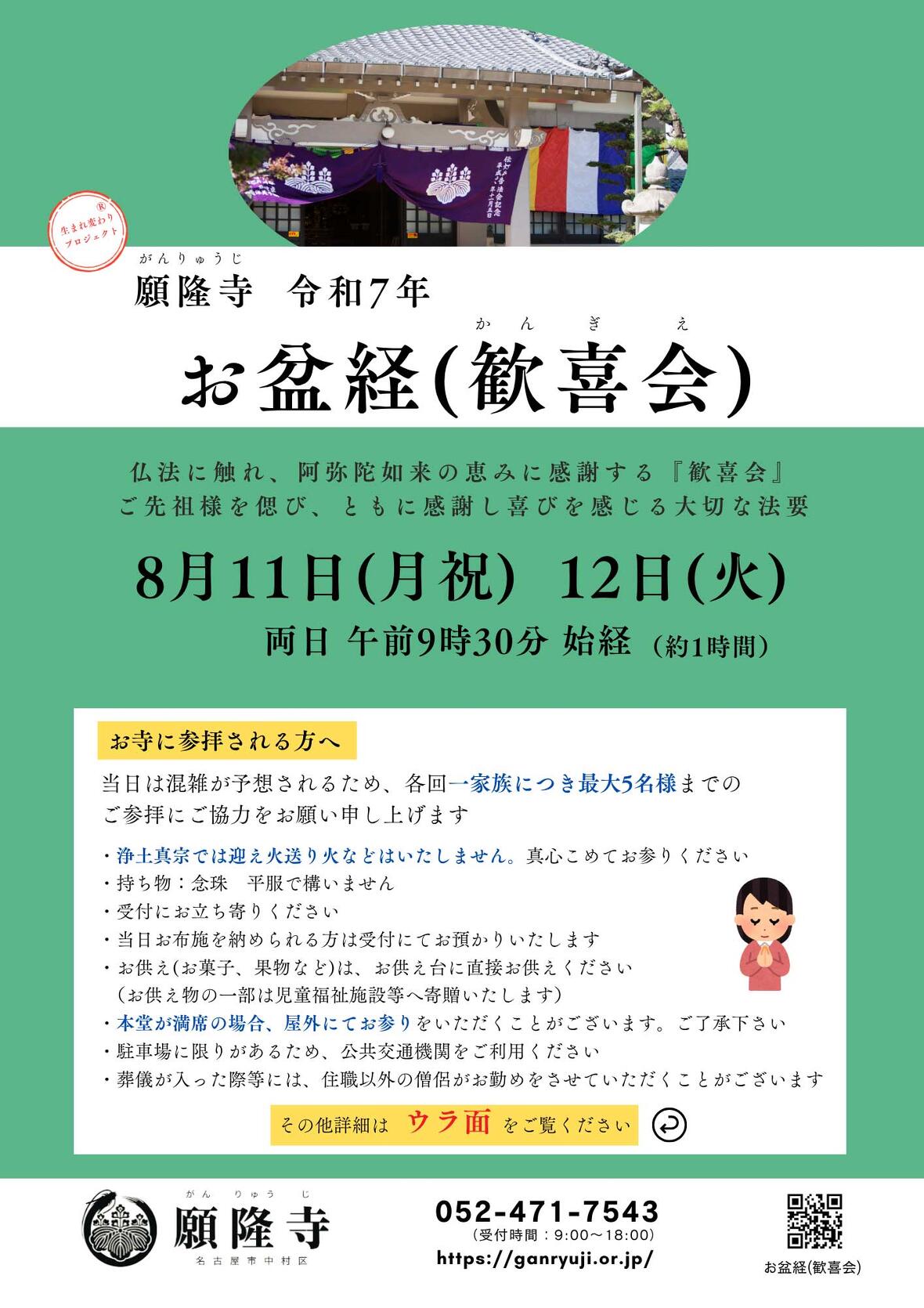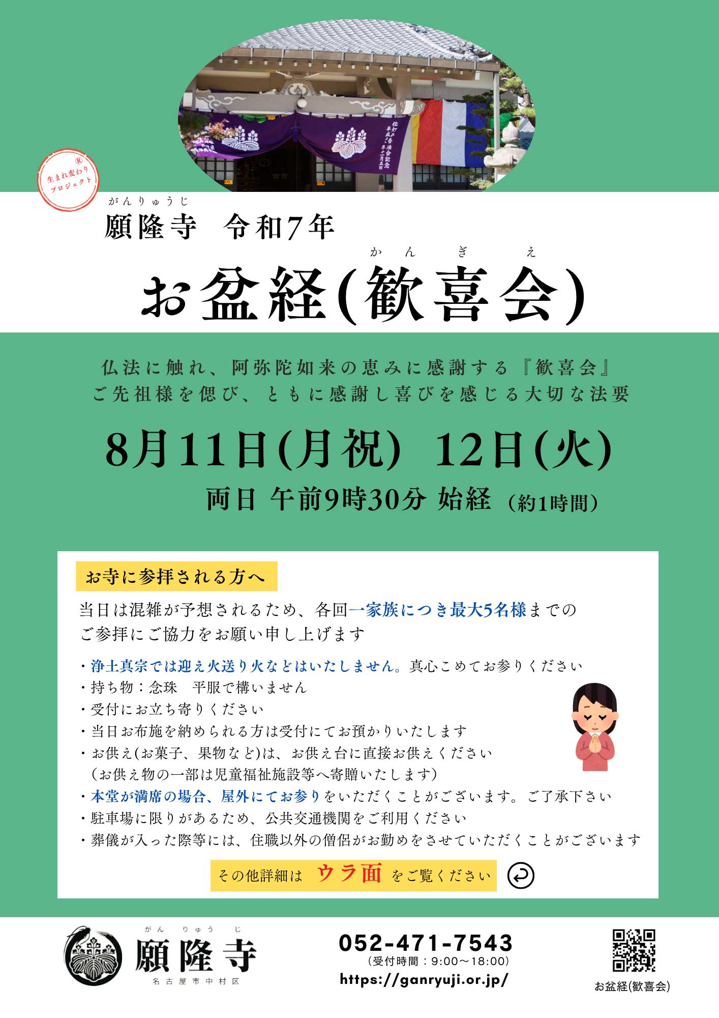 お盆経(歓喜会) 今年も下記の通りお盆経(歓喜会)を厳修いたしますので、ご参詣下さいますようご案内申し上げます。なお、檀信徒の皆様へのご案内及び、初盆の方へのご案内は、書面にてお送りいたします。 今年も動画参拝を予定しておりますので、そちらのご案内もあわせてご覧ください。 初盆の方は書面にて時間をご確認ください 2025年8月11日[月・祝] 〜 8月12日[火] 午前9時30分 始経 皆様のご参詣をお待ちいたしております