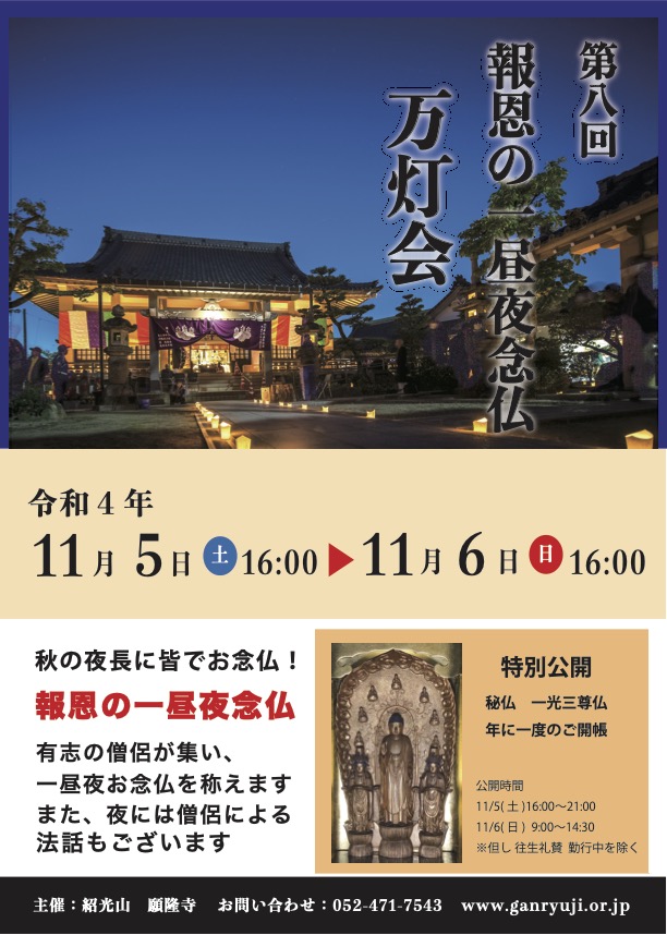 今年も、11月5日から6日にかけて、『報恩の一昼夜念仏・万灯会(まんとうえ)』を行います。