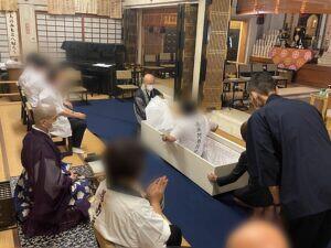 お1人ずつ、順番に棺の中に入ります。住職のお経が静かに始まります。