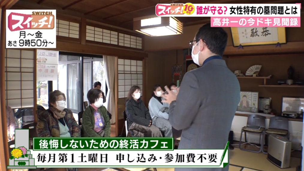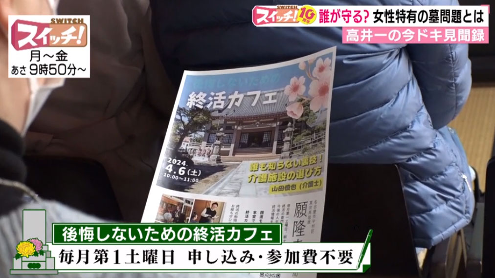 2024年3月14日(木)放送「スイッチ!(東海テレビ系 月~金 9:50〜11:14)」で、願隆寺の「後悔しないための終活カフェ」「永代供養墓」を取り上げていただきました!時代とともに変化していくお墓事情の特集でした。