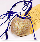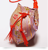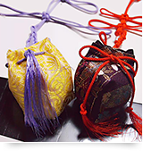 「訶梨勒」というのは、新年や慶事の席に飾られる袋物のこと。中には、お香と訶子の実が入っています。古来、薬用の実として大切に保存されていた訶梨勒(訶子の実)が病を治す霊力を尊ばれ、現在はお守りがわりとして袋物に形を変えたものと考えられています。