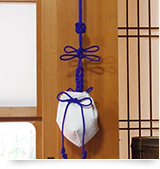 訶梨勒作りは、訶梨勒の実と、1年の月数を示す12種類の香木や香原料を袋に納め、組紐で結びを施して吊り下げます。(閏年には13種類が納められます。)